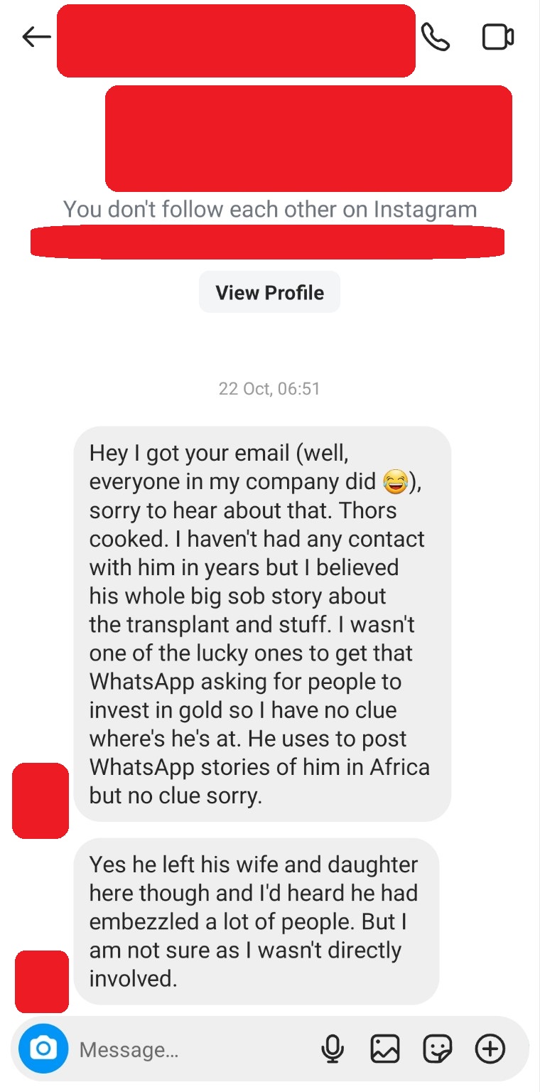 When Michael returned to Australia, Thor said they’d go to the police together and make a report together. This never happened and Thor showed no proactive interest in helping. Michael again asked Thor to help him with a Statutory Declaration form – Thor 1st provided an unsigned, undated and unspecific email without any detail. He later provided a PDF form. Michael asked Thor to sign it – he refused. Thor declared he was unemployed and self-signed the declaration (apparently Thor is qualified to sign Stat Decs, according to himself). Though unemployed his LinkedIn profile says he is a Property Development Superconnecter and currently Chief Investment Strategist at Bloomfield Capital Investments (empty website). An application for the winding up of Bloomfield Capital was commenced by Keen Planning pty ltd on 12/07/2022. Bloomfield Capital was deregistered on 04/05/2025. He is also currently: