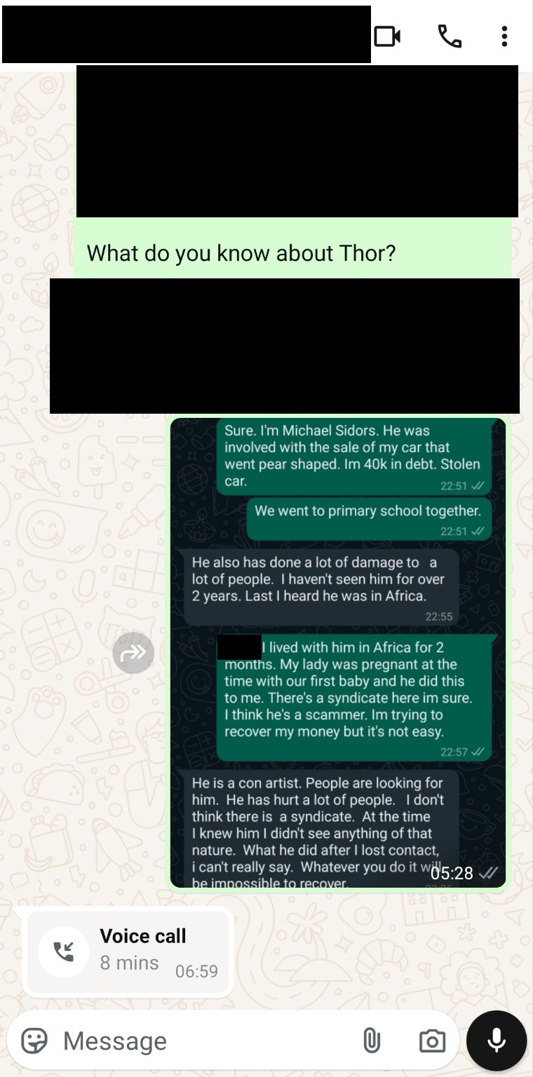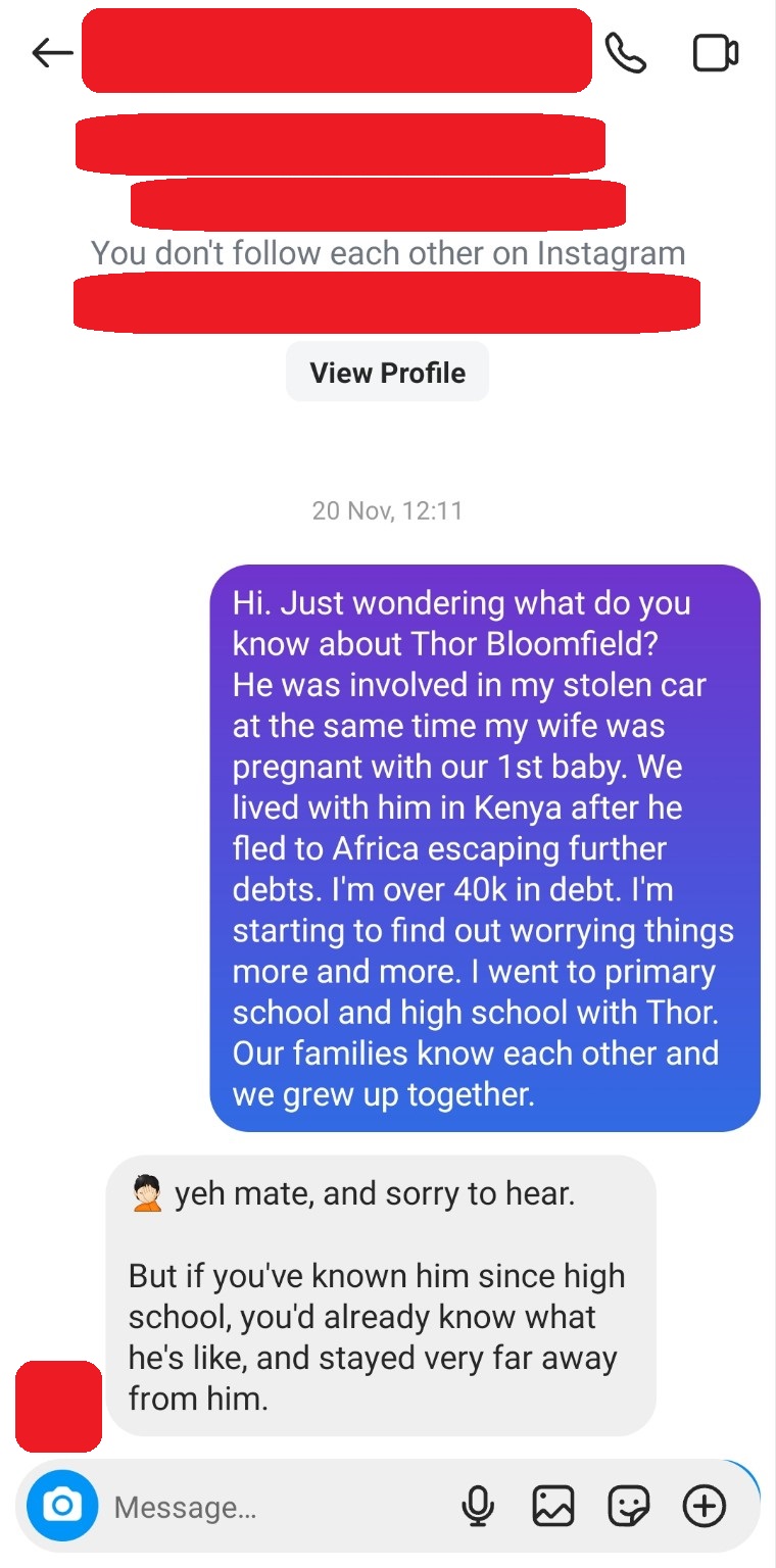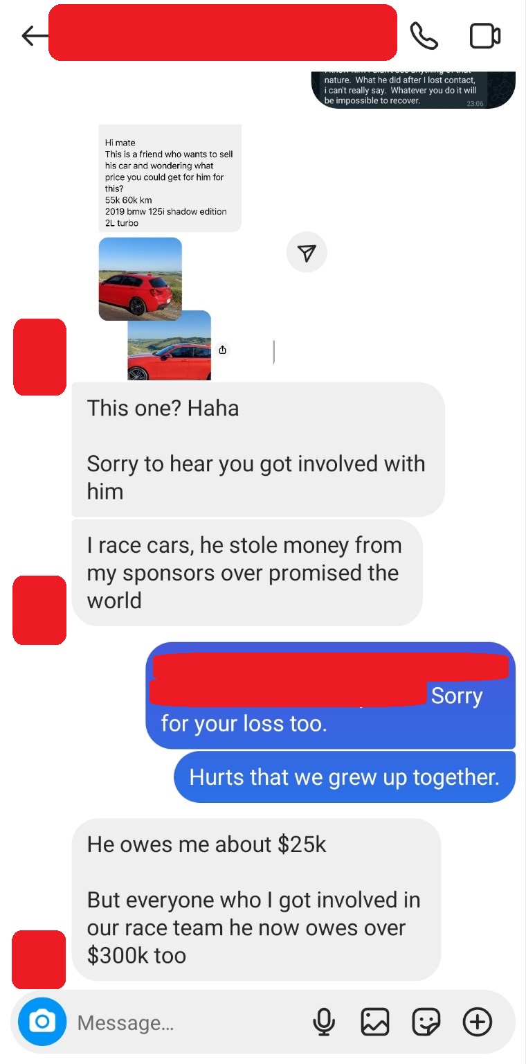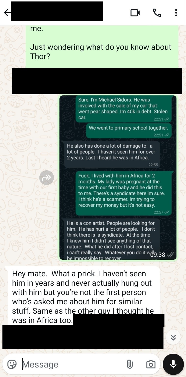 Thor flew home to Melbourne shortly before XMAS 2023 and informed Michael 2 hours before his flight. Thor’s mission was to help return the stolen car and funds and clean up the mess. When Michael returned to Australia 6 months later, without any car updates from Thor for 5 months, he went to speak with the purchaser of the car. The purchaser told him cash was paid for the car and Thor insisted on receiving cash and didn’t want phone messages exchanged. The purchaser said there was something unusual about Thor – he was different. When Michael questioned Thor about the car sale, he said he saw no money.