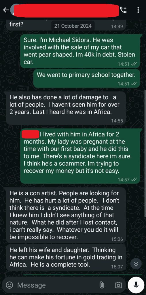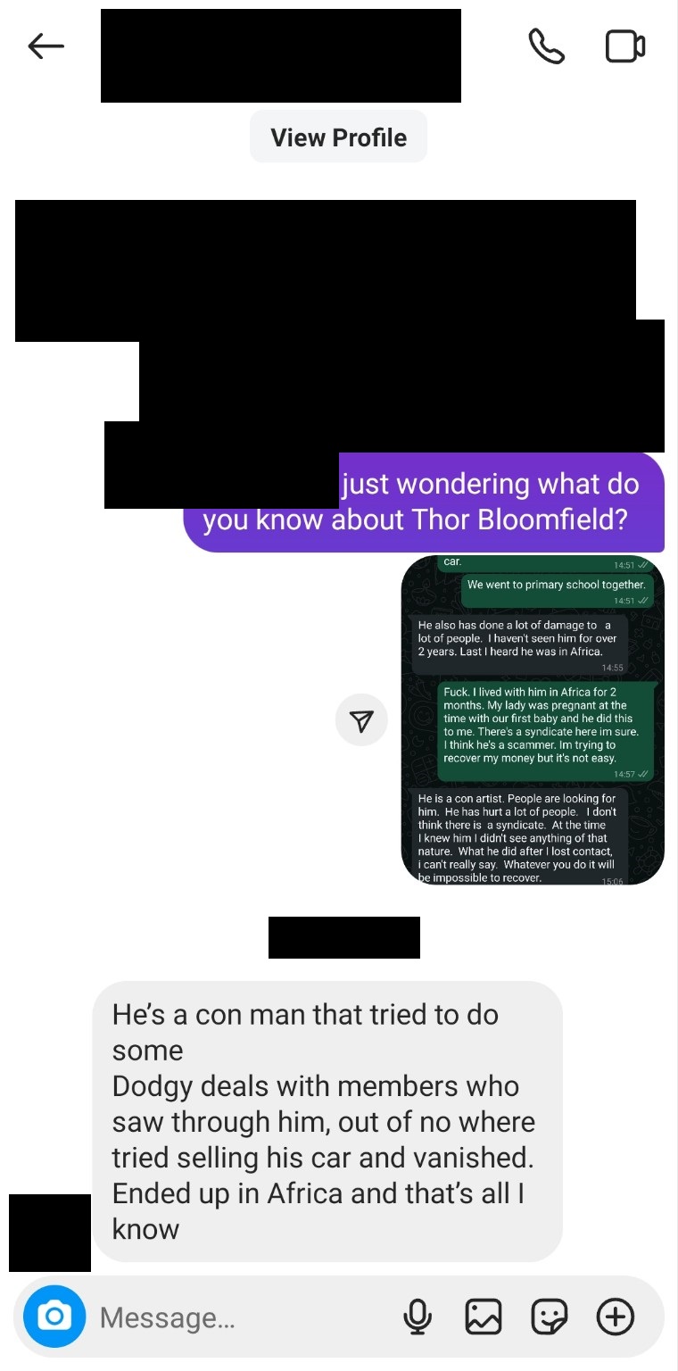 “He’s a conman that tried to do some dodgy deals … out of nowhere [he] tried to sell his car and vanished.”